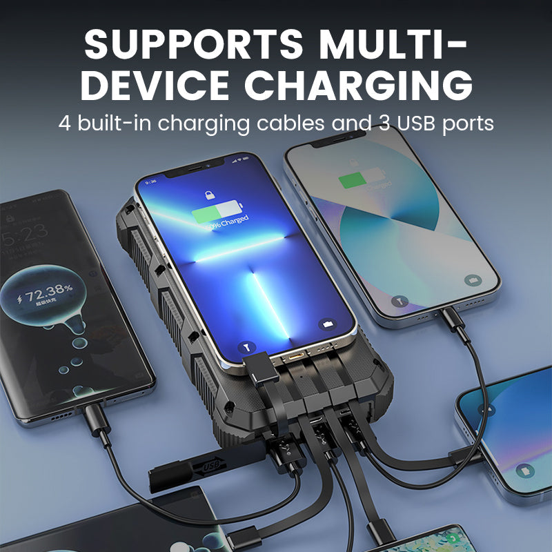 COMPATIBLE CON LA CARGA DE MÚLTIPLES DISPOSITIVOS – Con 4 cables de carga integrados y 3 puertos USB, puede cargar hasta 7 dispositivos simultáneamente. El sistema de distribución de energía compartida equilibra el flujo de corriente, evitando sobrecargas y manteniendo velocidades de carga eficientes para todos los dispositivos conectados.